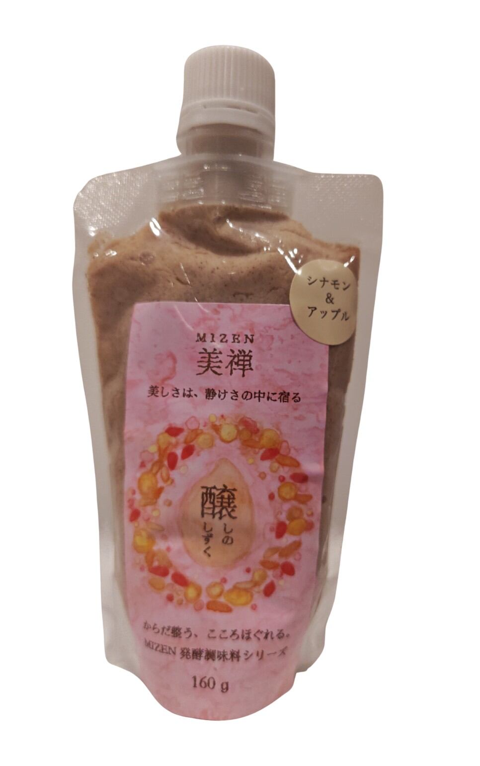 「美禅 醸(かも)しのしずく シナモン&アップル」は、豆乳と米油をベースにした植物性の発酵マヨネーズ風調味料です。発酵調味料にりんごの甘みと有機シナモンの香りを合わせ、やさしくまろやかな味わいに仕上げました。スイーツ感覚で楽しめる発酵マヨネーズ風調味料で、トーストやヨーグルト、パンケーキ、サラダにもよく合います。発酵のコクと果実の香りが広がる、体にやさしいナチュラルテイストの調味料です。